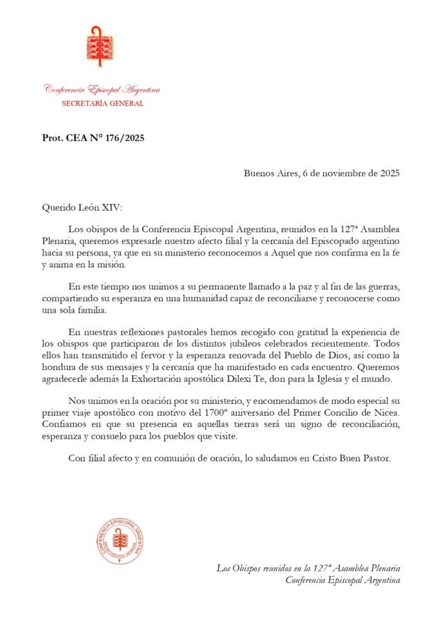 Los obispos argentinos, reunidos en la 127ª Asamblea Plenaria del Episcopado, le enviaron una carta al Papa León XIV, por medio de la cual desean «expresarle el afecto filial y la cercanía del Episcopado argentino hacia su persona, ya que en su ministerio reconocemos a Aquel que nos confirma en la fe y anima en la misión».